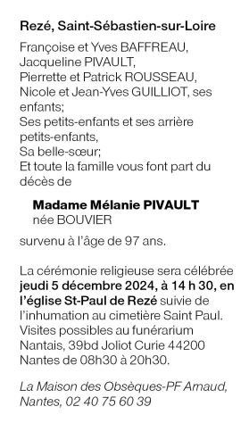 Décédée à Saint-Sébastien-sur-Loire (44230, France) le lundi 2 décembre 2024 à l'âge de 97 ans