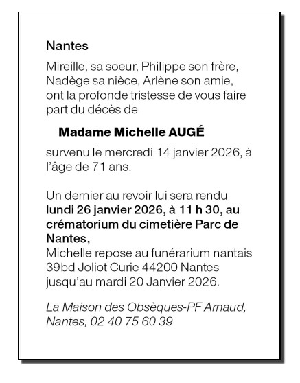 Décédée à Nantes (44100, France) le mercredi 14 janvier 2026 à l'âge de 71 ans