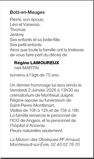 Décédée à Ancenis (44150, France) le vendredi 26 décembre 2025 à l'âge de 75 ans