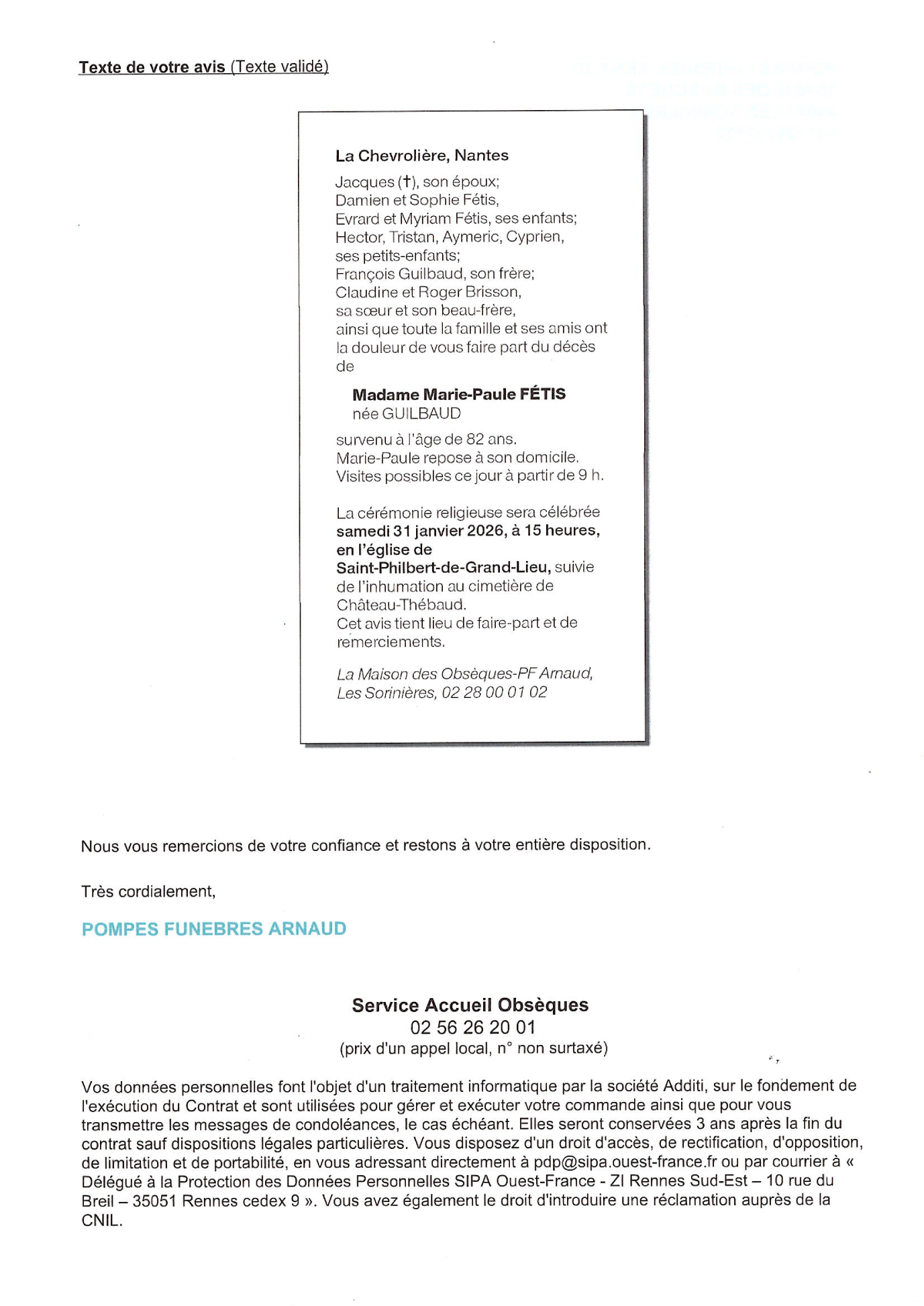 Décédée à La Chevrolière (44118, France) le mercredi 28 janvier 2026 à l'âge de 82 ans