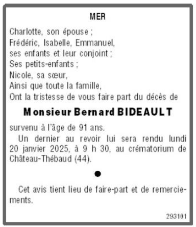 Décédé à Les Sorinières (44840, France) le mardi 14 janvier 2025 à l'âge de 91 ans