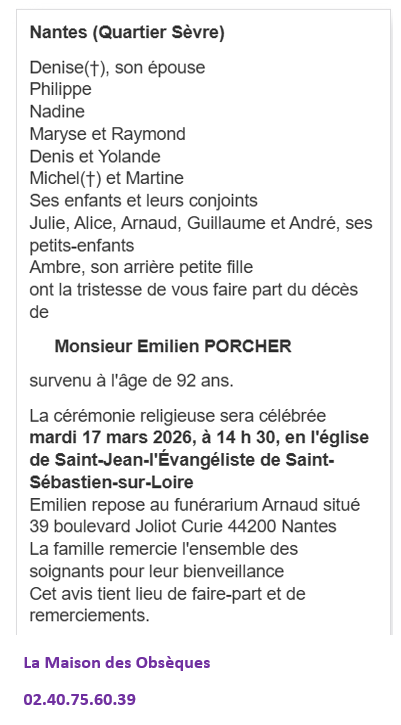Décédé à Nantes (44000, France) le jeudi 12 mars 2026 à l'âge de 92 ans