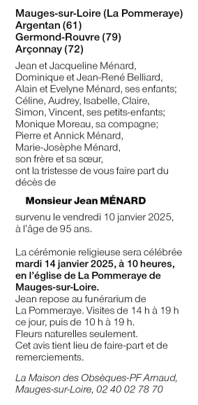 Décédé à La Pommeraye (49620, France) le vendredi 10 janvier 2025 à l'âge de 95 ans