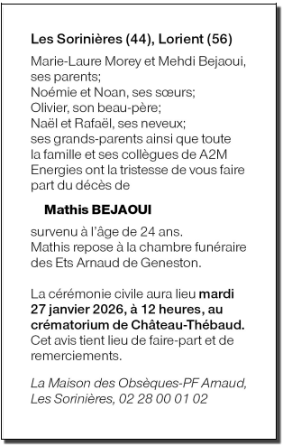 Décédé à Les Sorinières (44840, France) le vendredi 16 janvier 2026 à l'âge de 24 ans