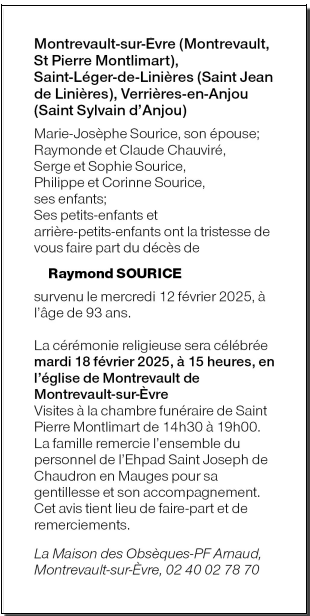 Décédé à Chaudron en Mauges (49110, France) le mercredi 12 février 2025 à l'âge de 93 ans