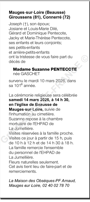 Décédée à La Jumellière (49120, France) le mardi 10 mars 2026 à l'âge de 100 ans