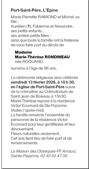 Décédée à Sainte-Pazanne (44680, France) le vendredi 6 février 2026 à l'âge de 98 ans