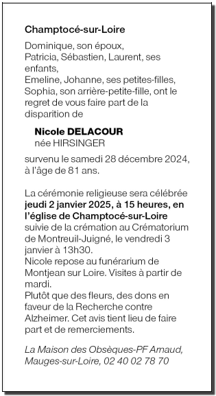 Décédée à Angers (49000, France) le samedi 28 décembre 2024 à l'âge de 81 ans