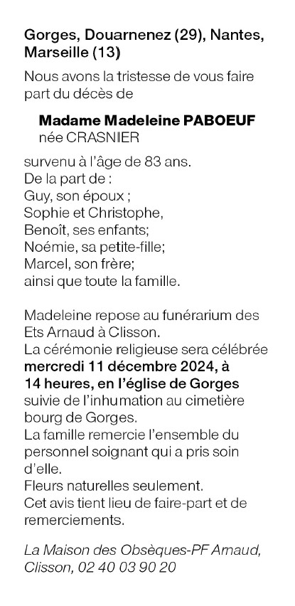 Décédée à Gorges (44190, France) le dimanche 8 décembre 2024 à l'âge de 83 ans