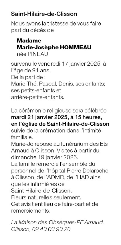 Décédée à Saint-Hilaire-de-Clisson (44190, France) le vendredi 17 janvier 2025 à l'âge de 91 ans